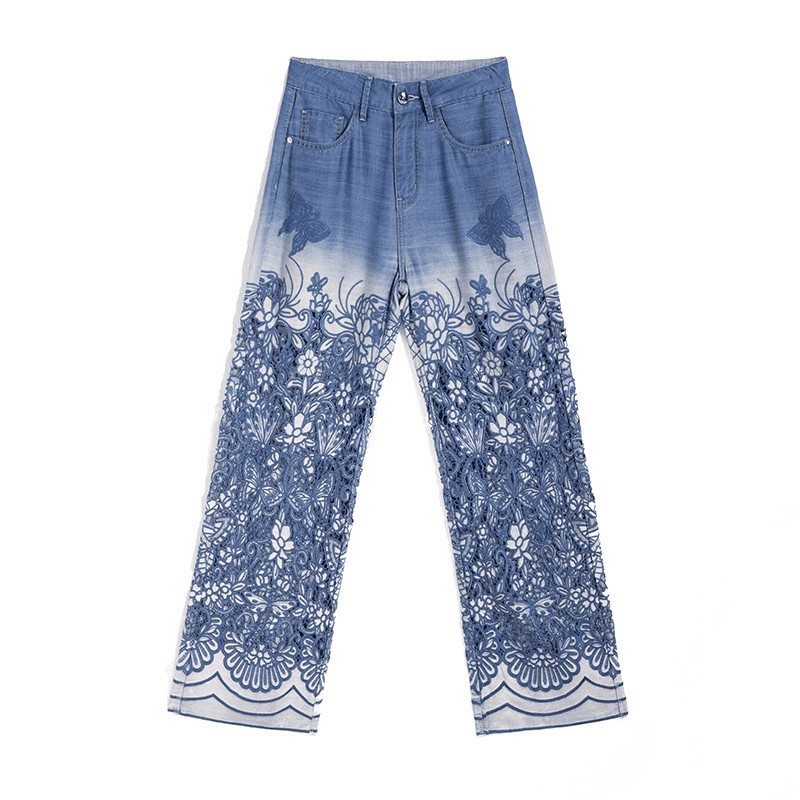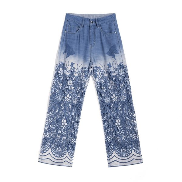 Lightweight baggy jeans with gradient-wash & embroidered cut-outs