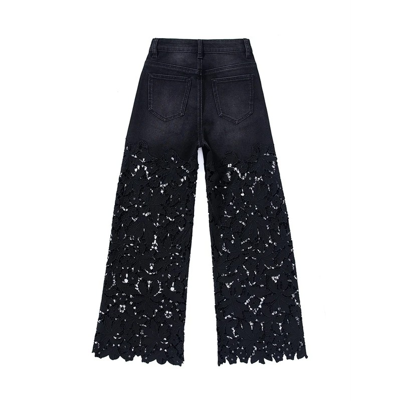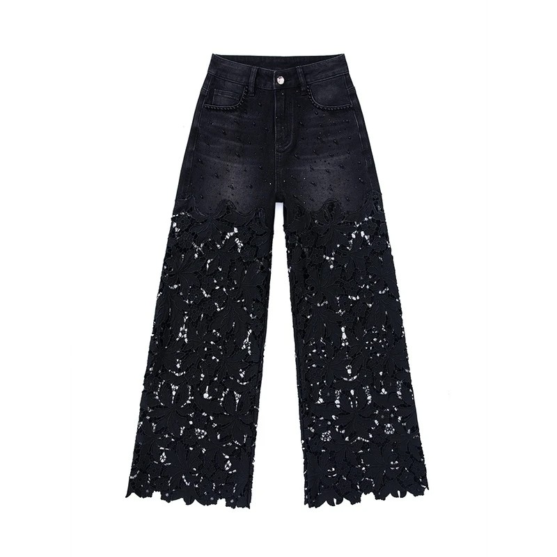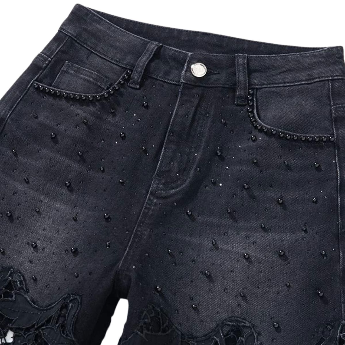 Wide-leg jeans with floral-embroidered cut-outs and pearl & rhinestone embellishments