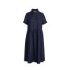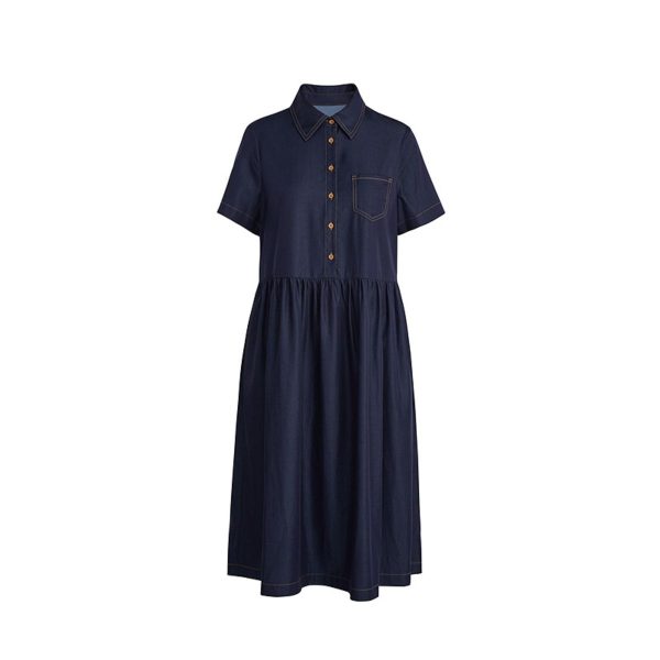 Oversized midi shirtdress with a shirred skirt and short sleeves in a lightweight denim