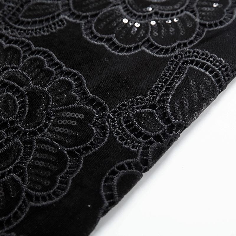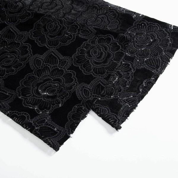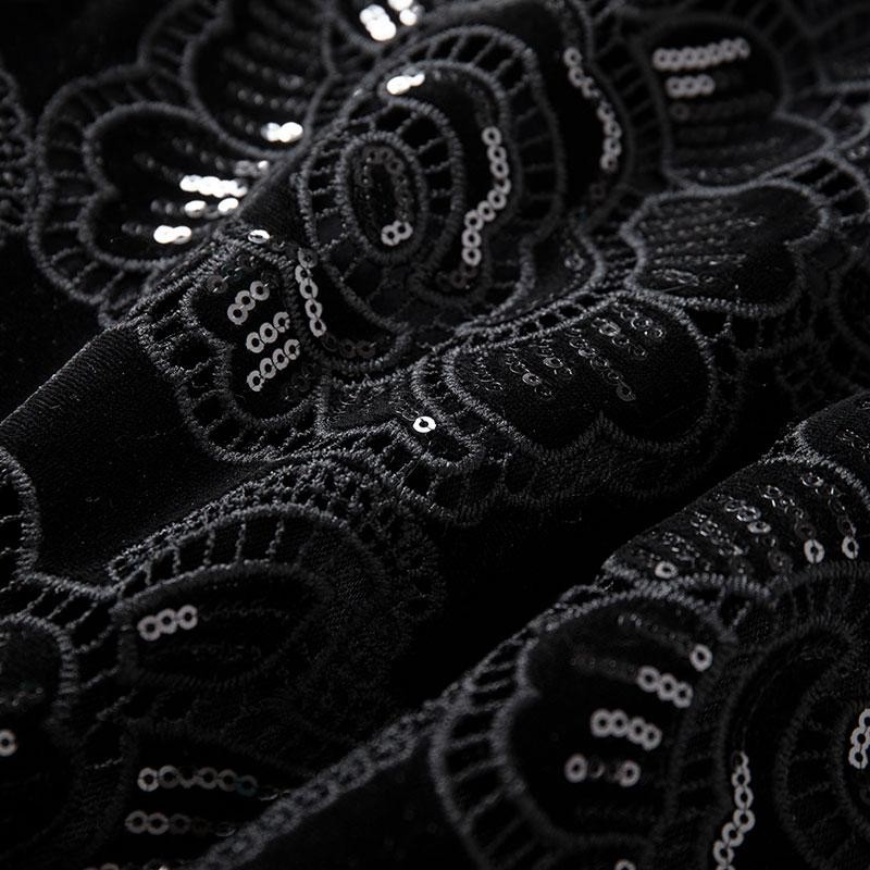 Hand-embroidered floral patchwork with sparkling sequin embellishments from thigh downward