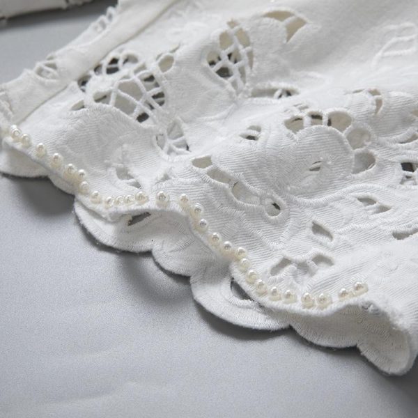 Irregular cut-out hemline with pearl embellishment along the front hem edge