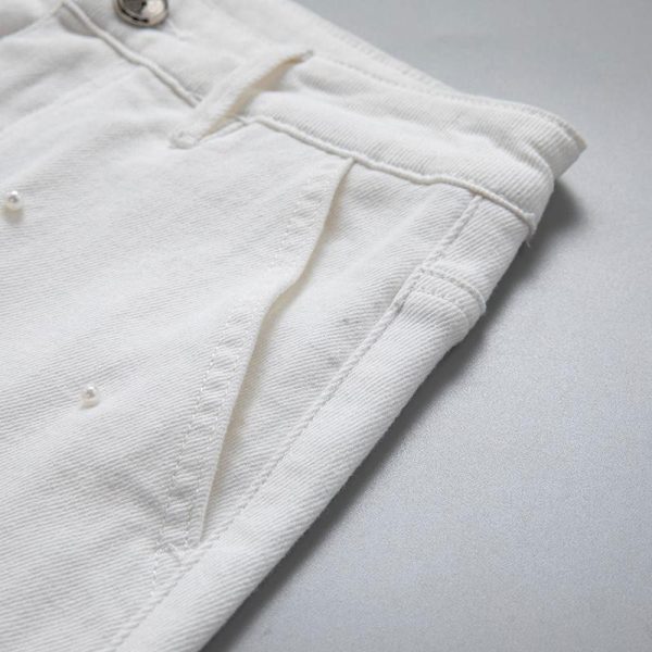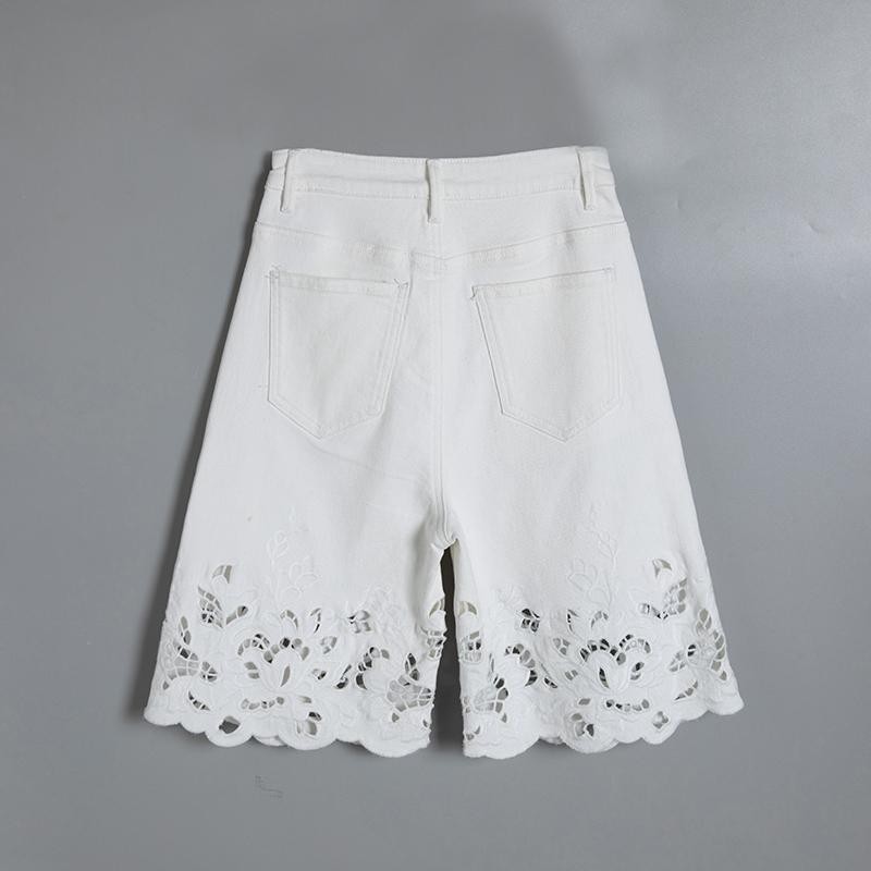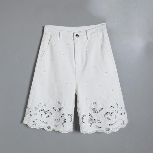 Pearl-embellished asymmetric denim shorts with deconstructed cut-outs