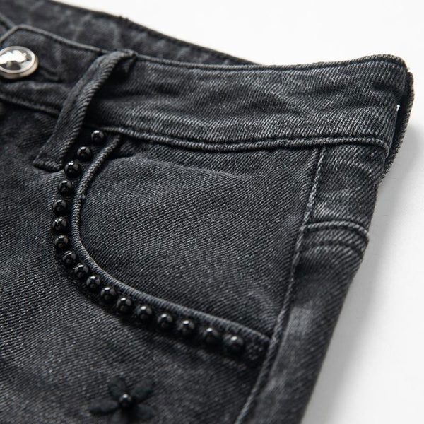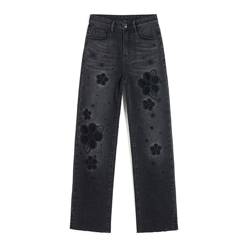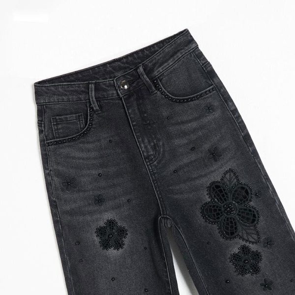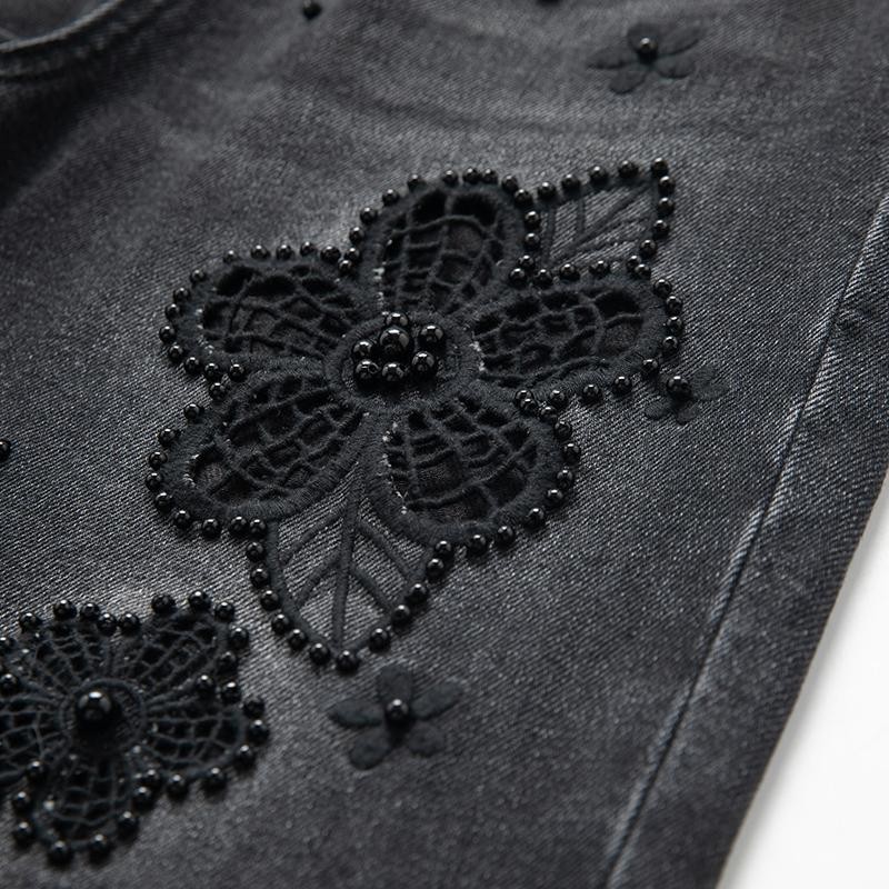 Hand-embroidered floral jeans with pearl beading & artisan cut-out detailing