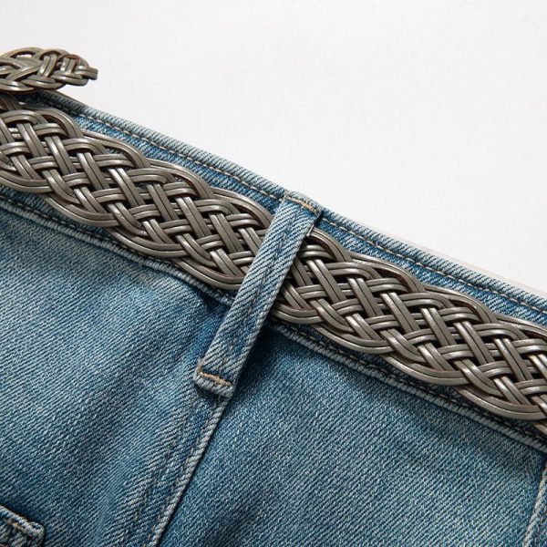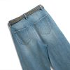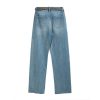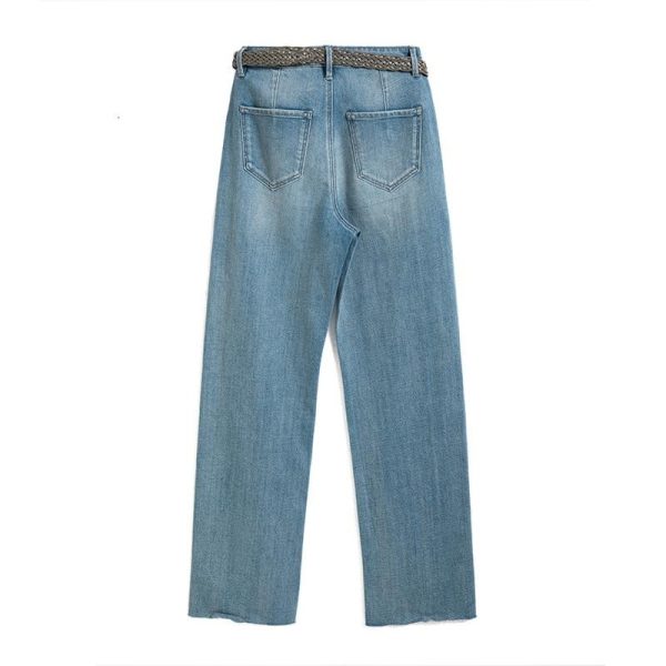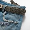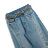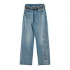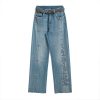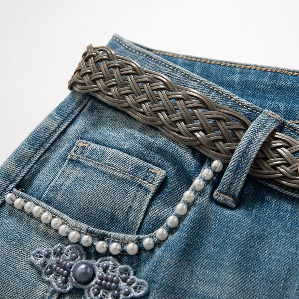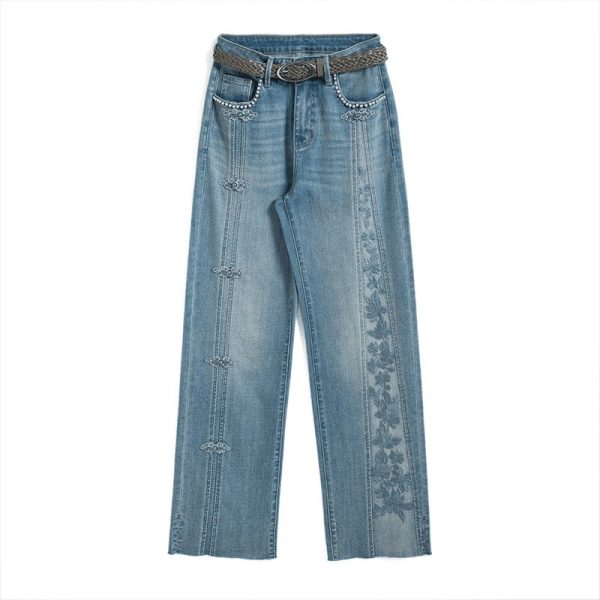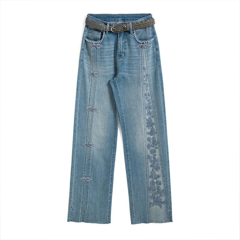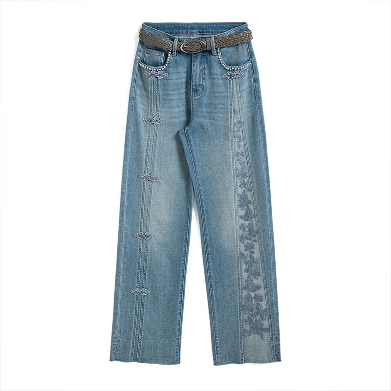 Asymmetric baggy jeans, Chinese pearl frog closures & lace embroidery details