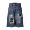 Deconstructed denim shorts-grunge camo patches & raw rips