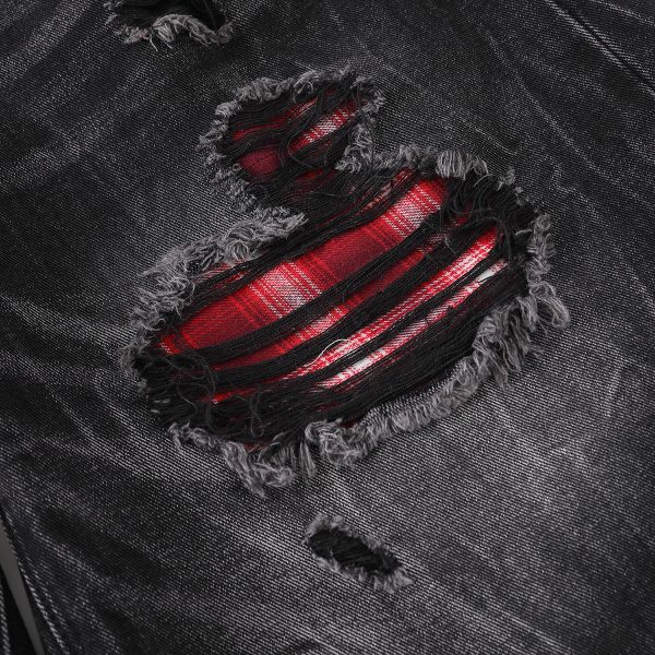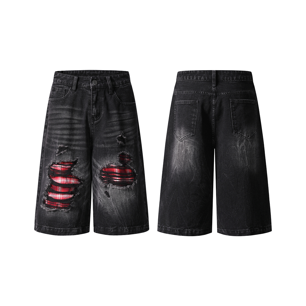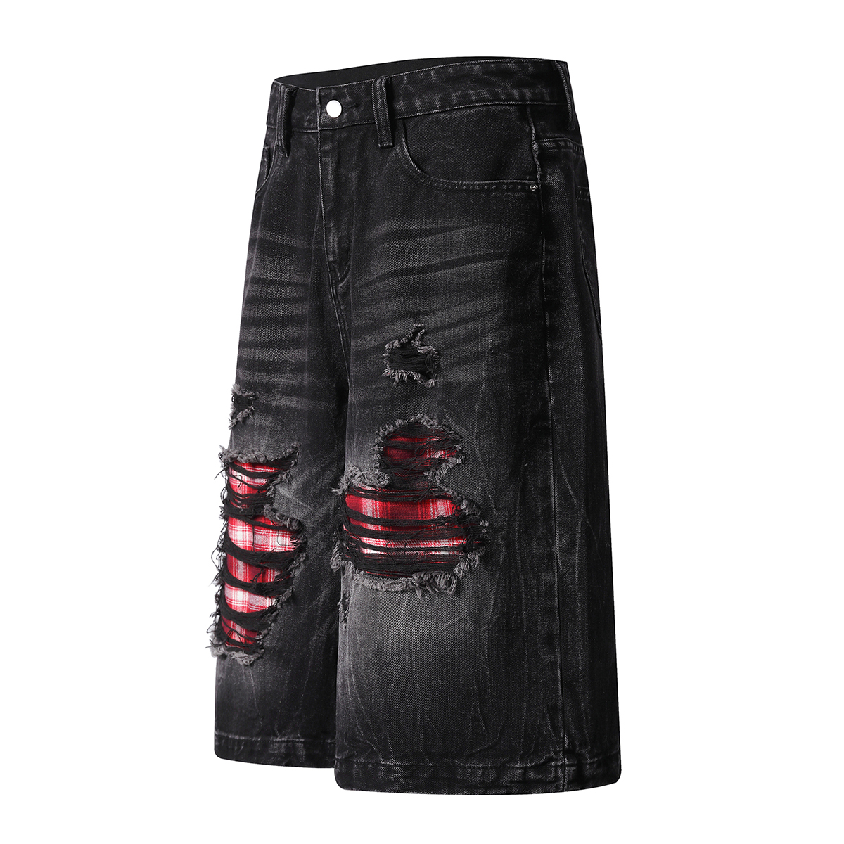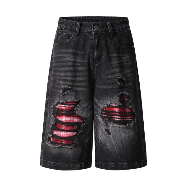 Deconstructed denim shorts-grunge plaid patches & raw rips
