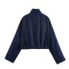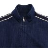 Zip-front gathered denim jacket with contrast stripes
